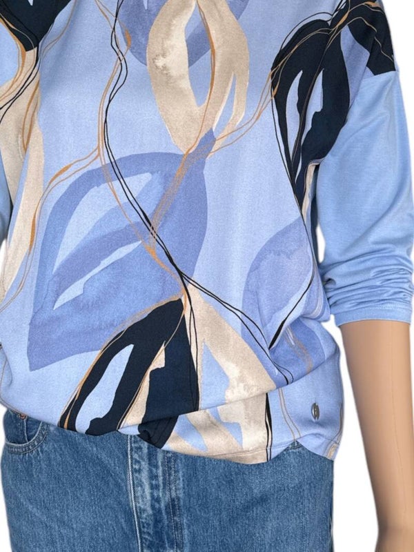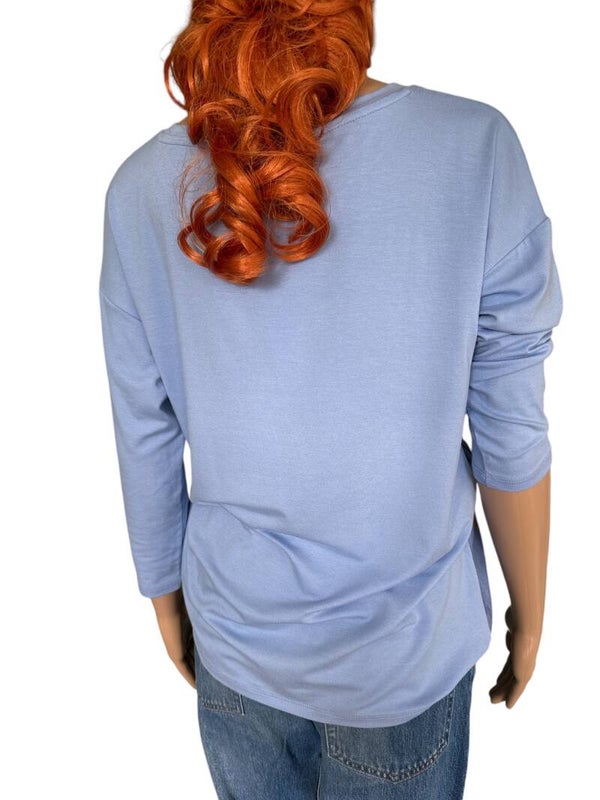 Pull léger et agréable à porter, idéal pour la mi-saison. Couleur bleue avec motif floral. Parfait pour un look décontracté et tendance.