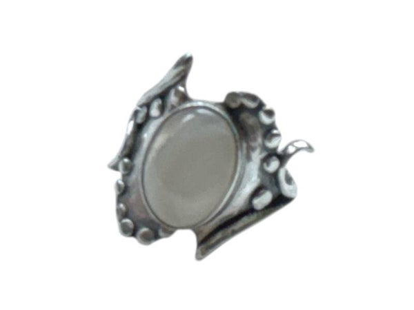 Bague vintage en argent massif 925 et pierre de lune. La monture est travaillée avec des petites boules d'argent. La bague est en bon état général. Taille 54. Une belle pièce unique! O N'hésitez pas si vous avez des