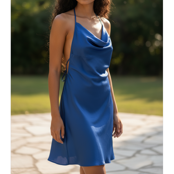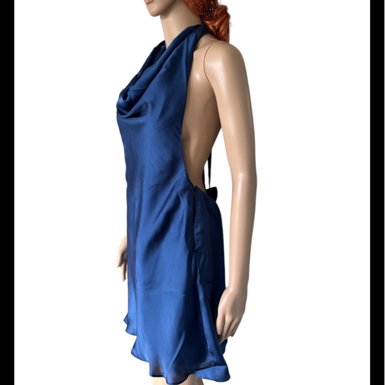 Robe bleu nuit en satin, taille S,/M avec dos nu et col bénitier. Portée une seule fois, en excellent état. Matière fluide et agréable à porter, idéale pour une soirée ou une occasion spéciale