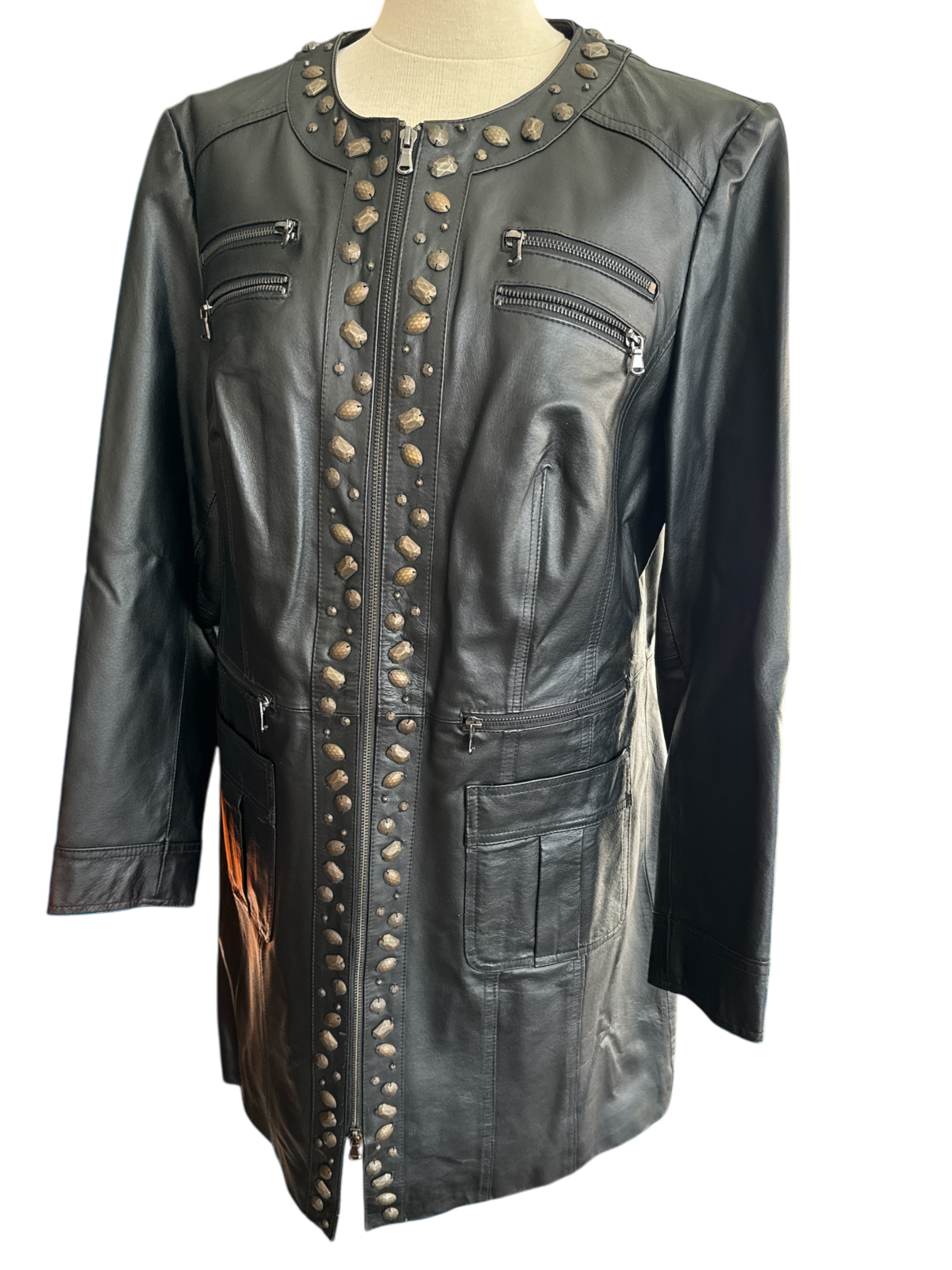 MANDARIN Veste en cuir noir, style rock, taille 46 avec des clous décoratifs sur le devant et les manches.
