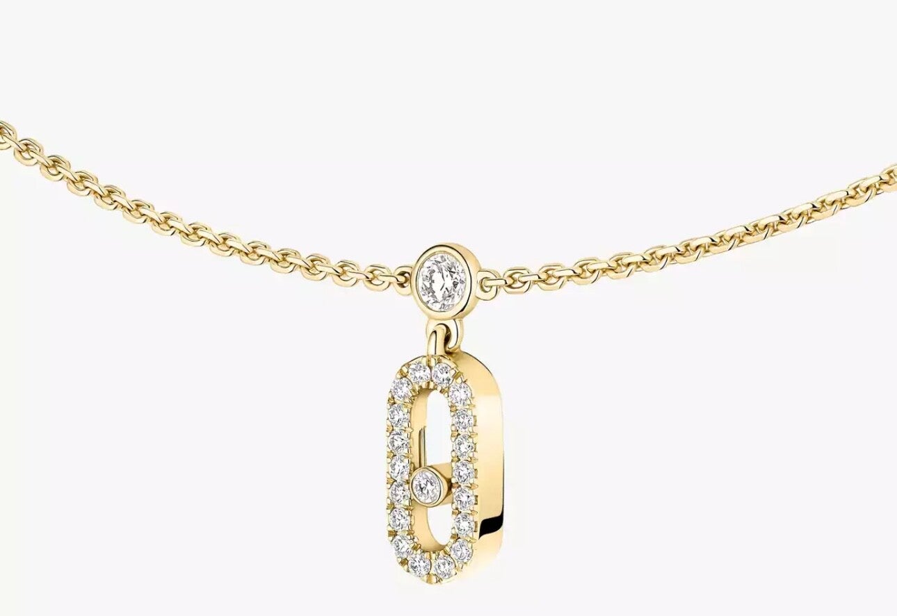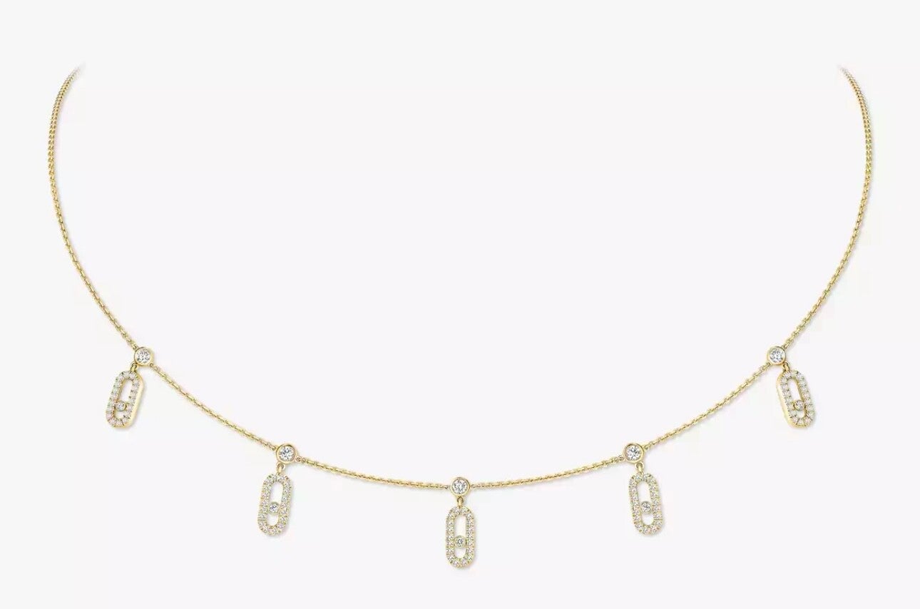 Decouvrez le collier Move Uno en or jaune et diamants. Sa chaîne en or jaune 18 carats est ornée de 5 charms Move Uno entièrement sertis de diamants étincelants, qui bougent au gré des mouvements. Ce collier femme est doté d'un fermoir mousqueton avec système coulissant qui vous permettra de le porter en collier choker ou en collier en ras du cou, selon vos envies. Une touche bohème chic pour un éclat sans pareil.