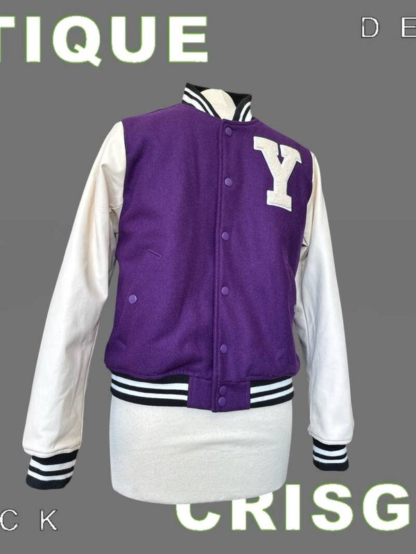 Magnifique veste, idéale pour la mi-saison! Look universitaire américain . Couleur violette profonde et manches en cuir synthétique blanc. Portée quelques fois, en excellent état. Taille S, coupe confortable. Parfaite pour un style décontracté et tendance.