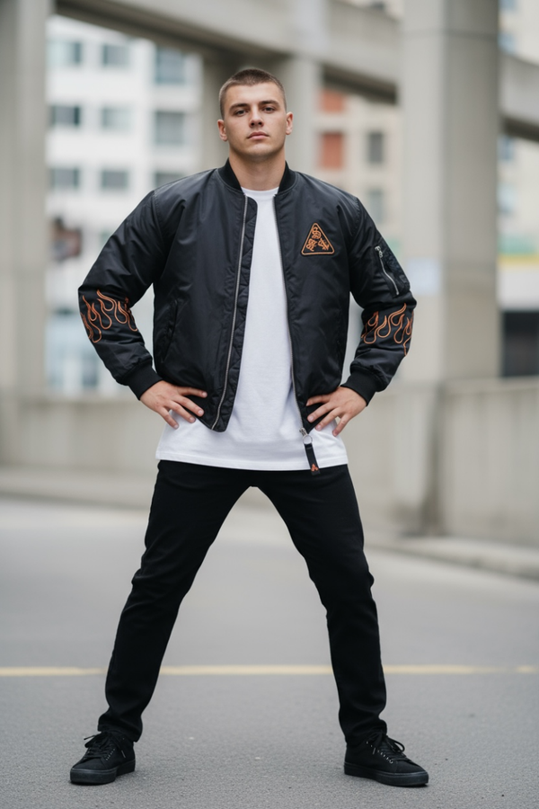 Superbe blouson aviateur noir, taille S, idéal pour la mi-saison. Détails uniques avec motifs de flammes sur les manches et patch stylé sur le devant. Fermeture éclair en parfait état. Porté quelques fois, en excellent état. Parfait pour un look edgy et tendance. Ne manquez pas cette pièce originale pour compléter votre garde-robe d'automne ! Matière légère et confortable. Un must-have pour les amateurs de mode.