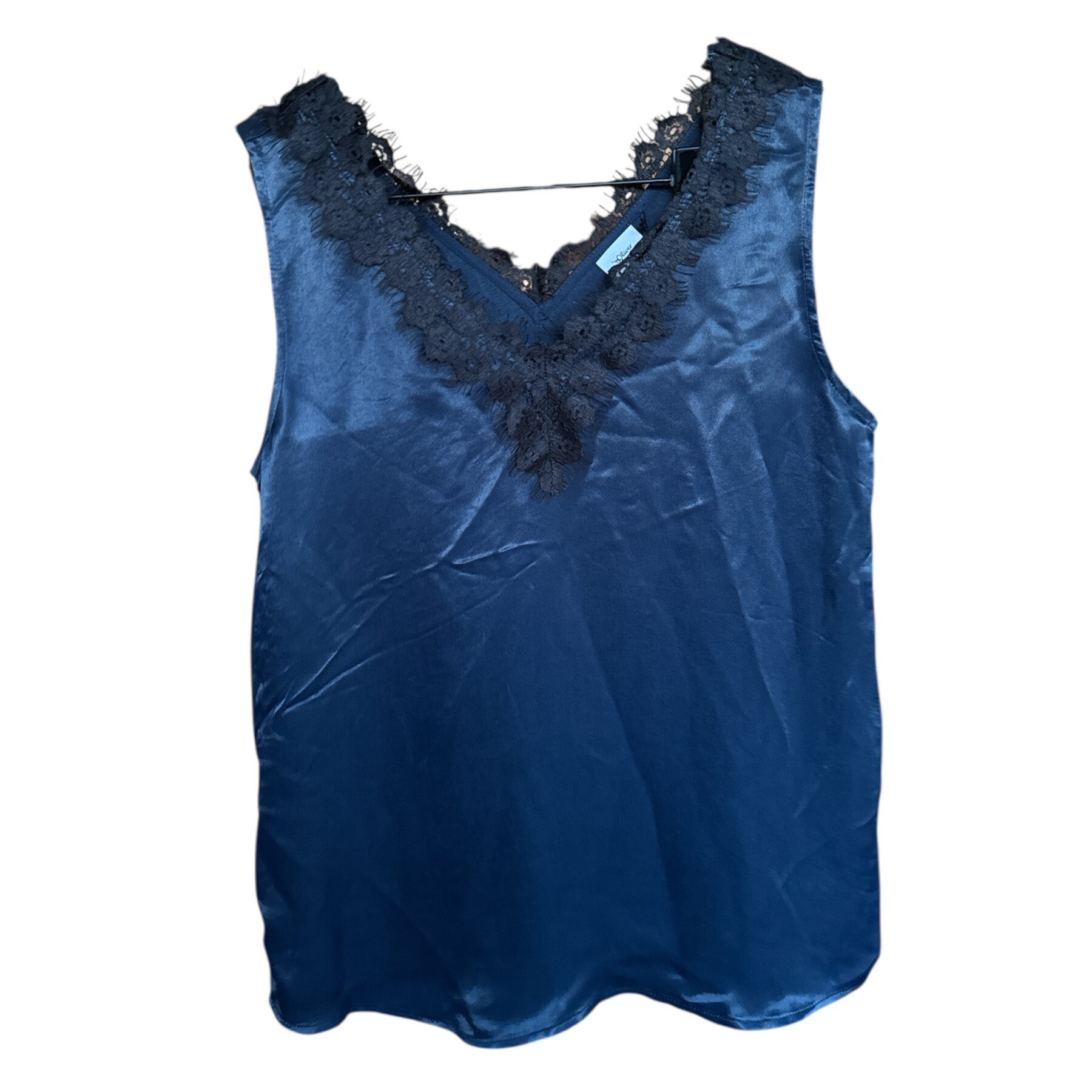 Ce top bleu marine est parfait, il est léger et confortable. La dentelle noire ajoute une touche d'élégance. Taille 34 mais grand, il s'adapte.