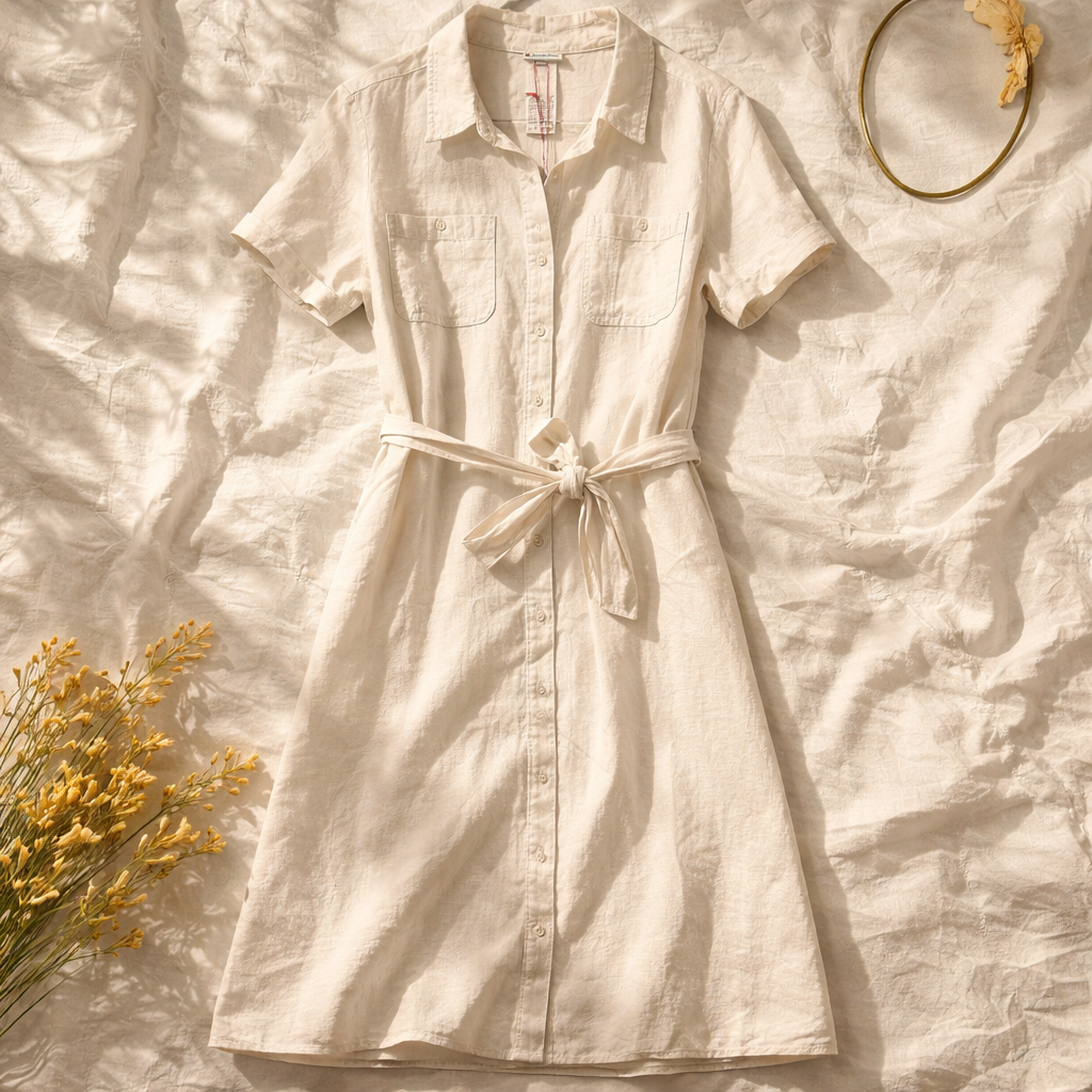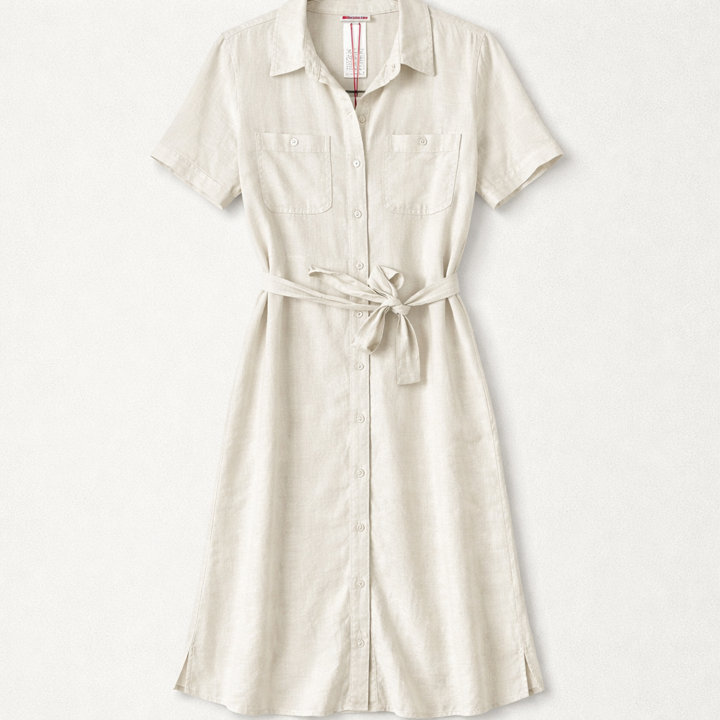 Cette robe chemise en lin est parfaite pour les journées chaudes. Légère et confortable, elle est idéale pour un look décontracté ou plus habillé.