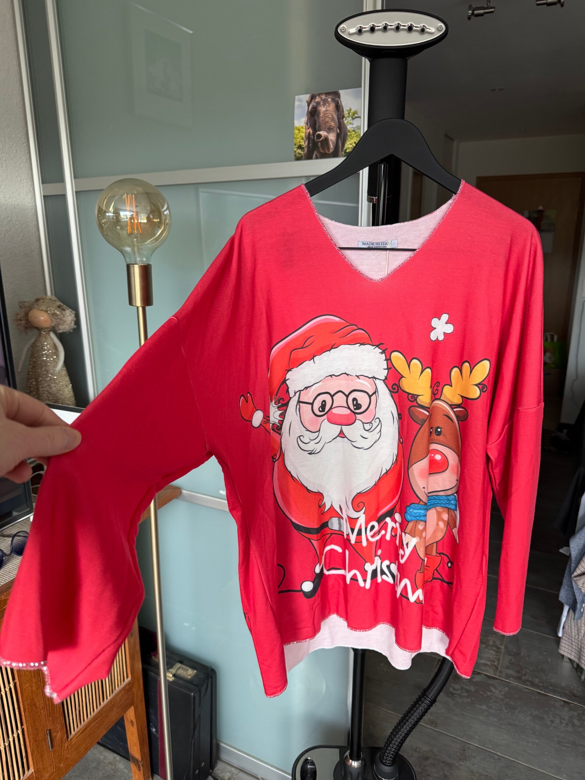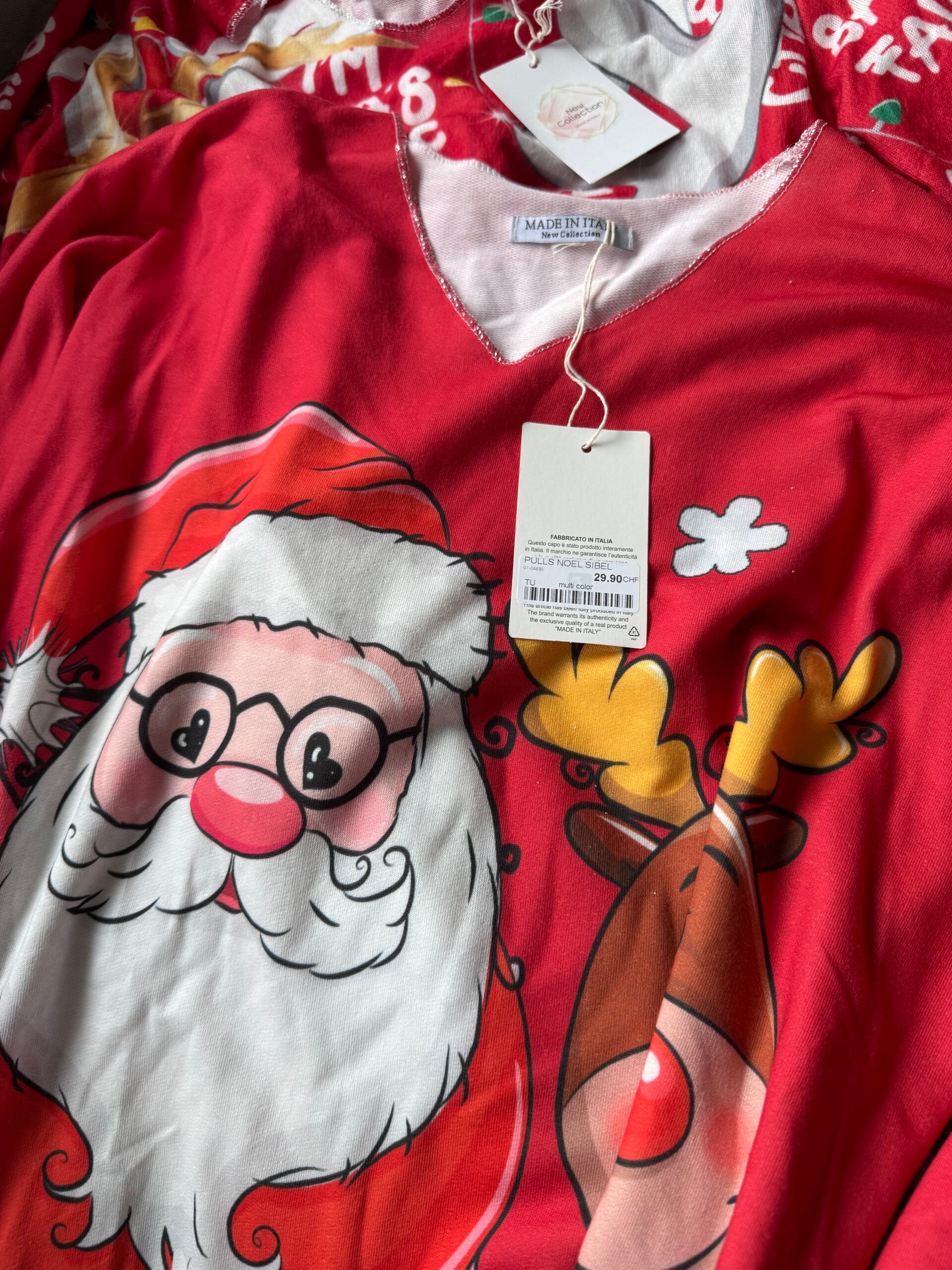 Ajoutez une touche de magie à vos fêtes avec ce pull de Noël unique! Neuf avec étiquette, jamais porté. Taille unique, coupe confortable. Parfait pour vos soirées de Noël, vos cadeaux originaux ou simplement pour répandre la joie! 'Motif amusant et festif avec le Père Noël et ses rennes. Fait en Italie, excellente qualité.