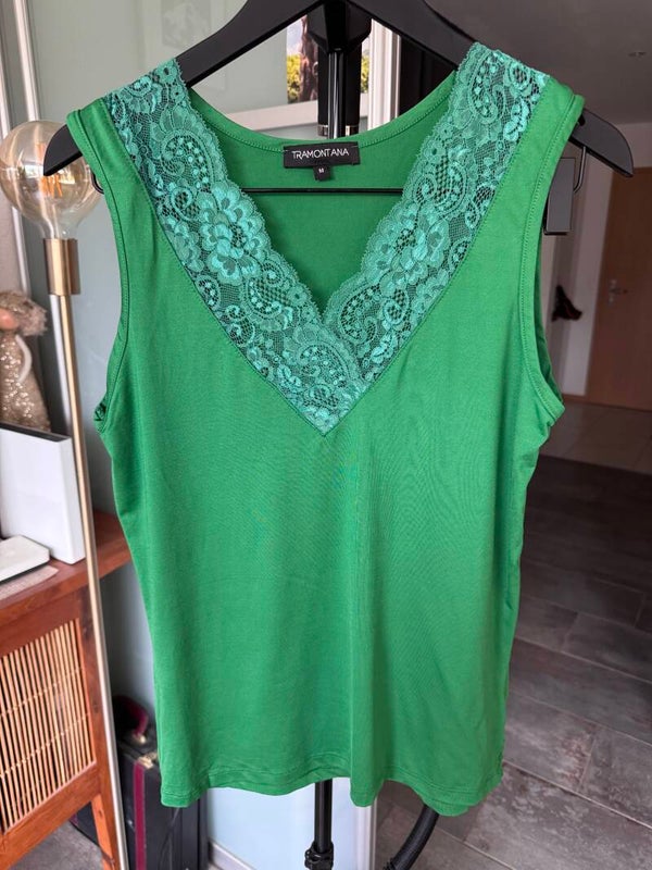 Ce haut vert Tramontana, taille M, est en très bon état. Il est orné de dentelle délicate autour du col en V, ajoutant une touche d'élégance discrète.