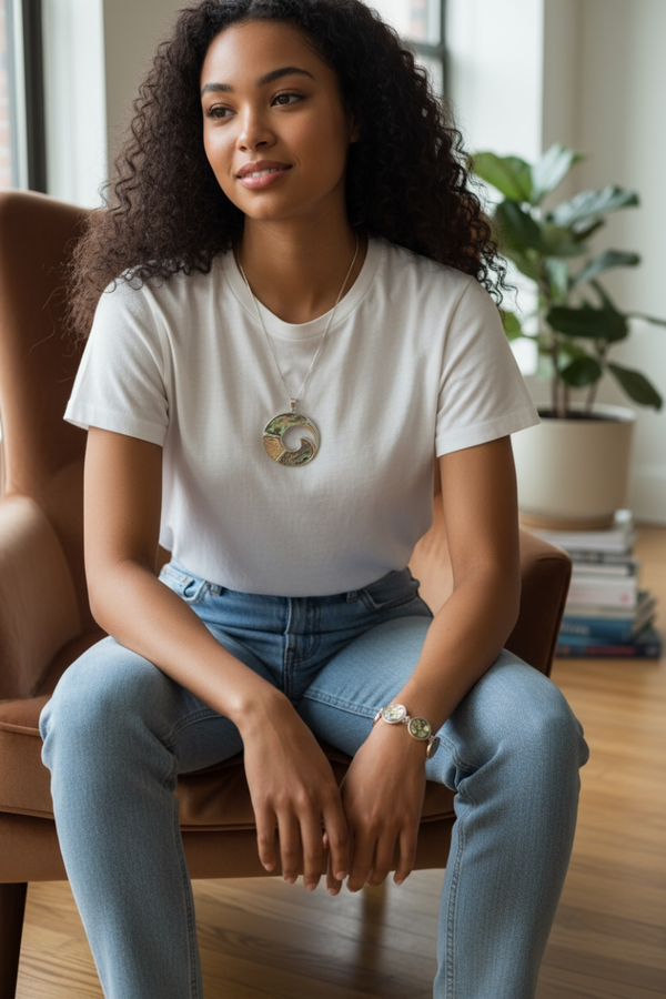 Magnifique parure composée d'un collier et d'un bracelet ornés de nacre chatoyante. Le collier se distingue par son pendentif original en forme de spirale. Le bracelet, quant à lui, est orné de plusieurs cabochons de nacre.