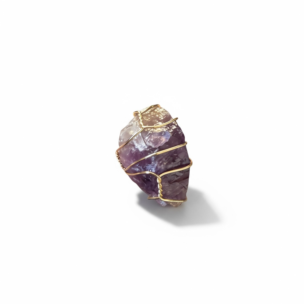 Bague en améthyste brute. L'améthyste est sertie de fil doré. On pense qu'elle soulage le stress et l'anxiété. La taille de la bague est ajustable.