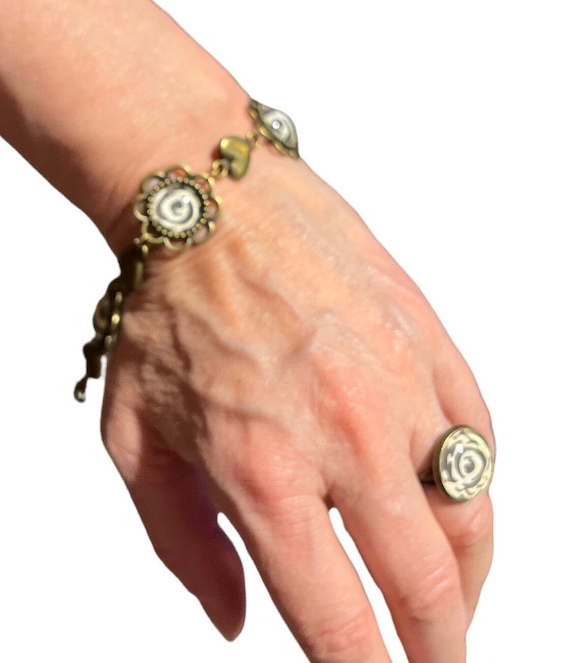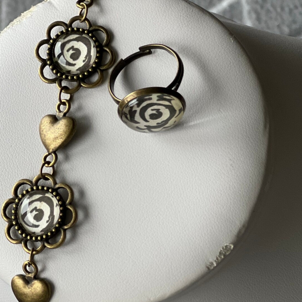 Ensemble bracelet et bague avec motifs de fleurs et de cœurs. Les fleurs contiennent une image en noir et blanc. Le bracelet mesure environ 18 cm de long et la bague est réglable.