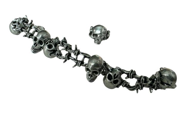 En acier inoxydable avec des têtes de mort et du barbelé. Ajustable grâce à sa fermeture.